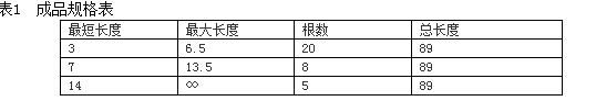原料按長(zhǎng)度分檔,通常以0.5米為一檔,如:3-3.4米按3米計(jì)算,3.5米-3.9米按3.5米計(jì)算,其余的依此類(lèi)推。表1是幾種常 見(jiàn)成品的規(guī)格,長(zhǎng)度單位為米,∞表示沒(méi)有上限,但實(shí)際長(zhǎng)度小于26米。